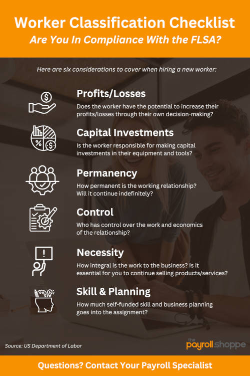 The DOL and IRS both have stringent requirements on what makes someone an employee or contractor. As a refresher, the Department of Labor and Fair Labor Standards Act focus on six factors:
